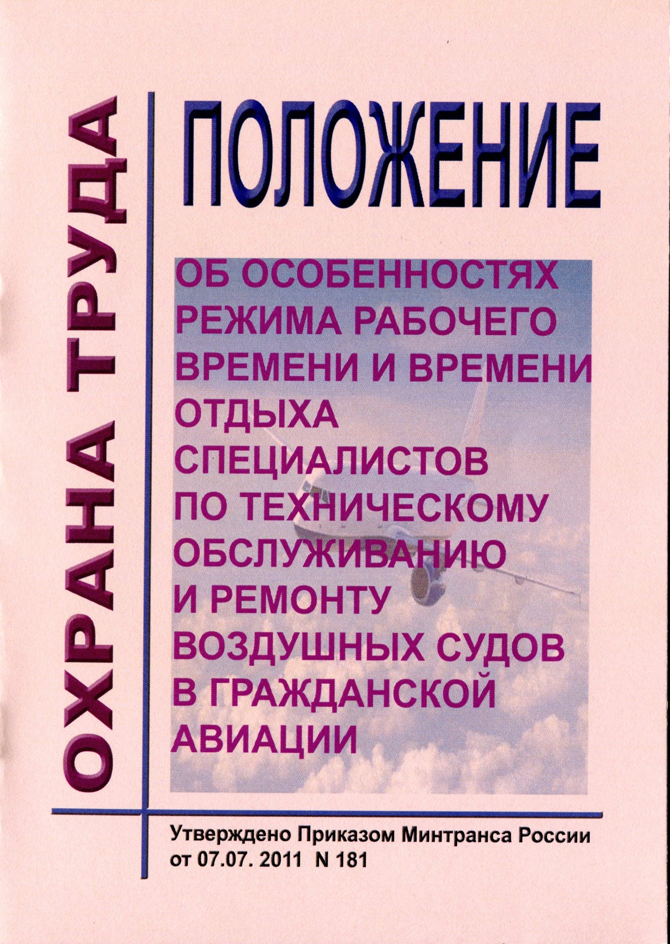 Положение об особенностях режима рабочего времени и времени отдыха специалистов по техническому обслуживанию и ремонту воздушных судов в гражданской авиации, утв.приказом Минтранса России от 07.07.2011 № 181, брошюра